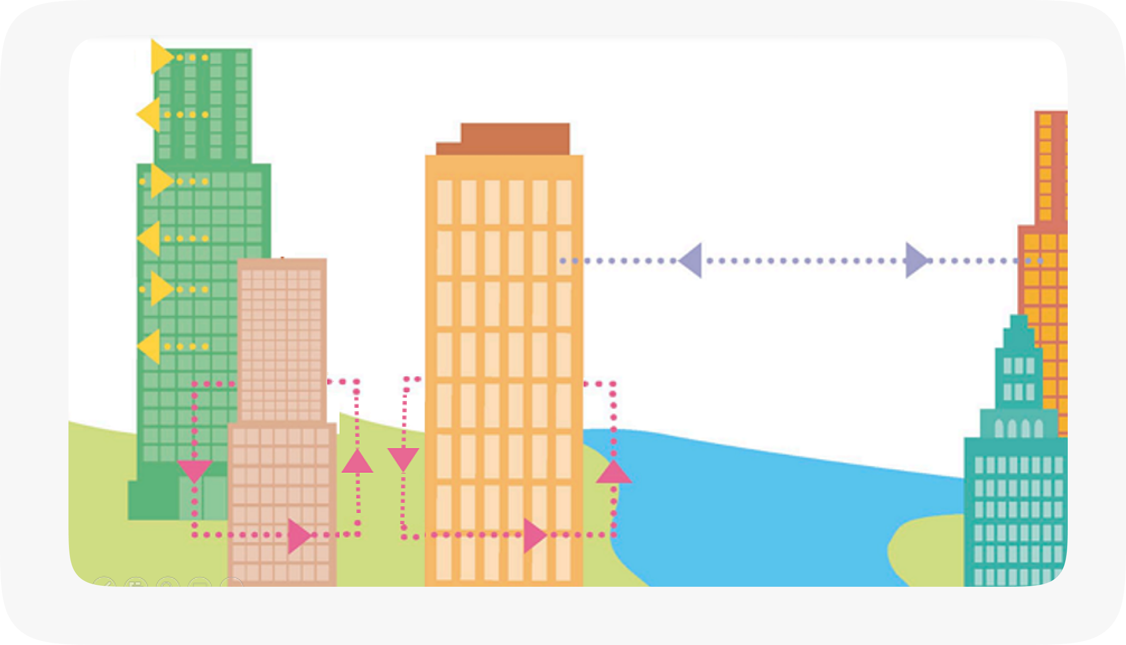 На малюнку представлено види комп’ютерних мереж. Зіставте колір стрілки та вид мережі.